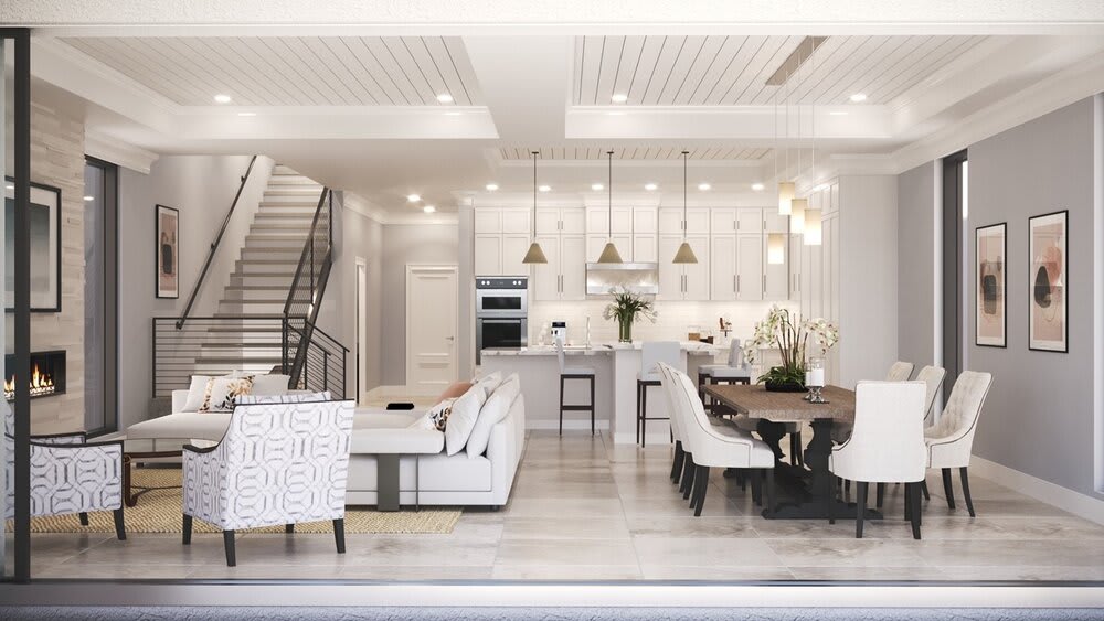 The ground floor of the Oceanfront Villa features a spacious two-car garage, chef’s kitchen, open living and dining areas leading out to the outdoor infinity pool deck.